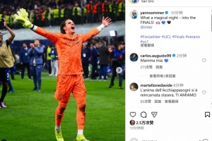 本场比赛索默如有神助,7次扑救帮助球队拿下胜利,赛后索默在个人社媒晒出庆祝照,配文写道:“多么神奇的夜晚,我们晋级决赛!”